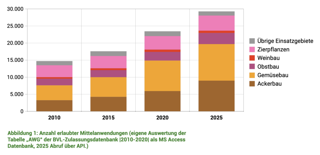 Noch nie waren in Deutschland so viele Pestizid- Anwendungen erlaubt wie heute. Im November 2025 waren nahezu 30.000 Mittel-Anwendungen genehmigt. Da viele genehmigte Mittel mehrmals in der Vegetationsperiode eingesetzt werden dürfen, ergeben sich nahezu 80.000 staatlich erlaubte Spritzmöglichkeiten.